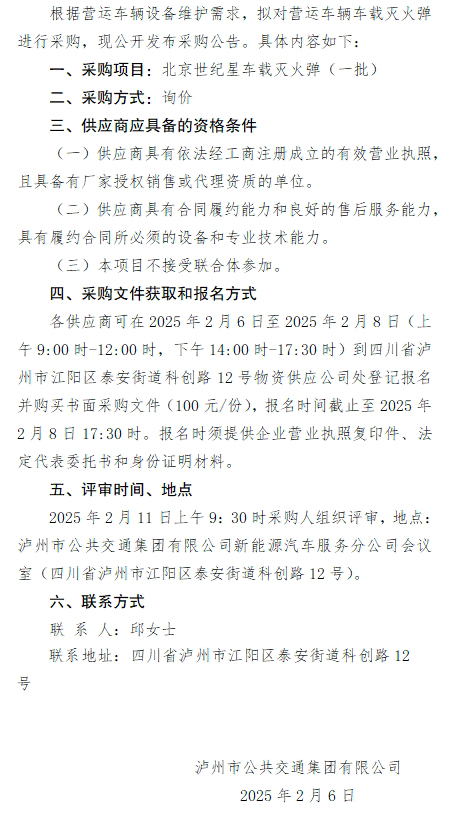 瀘州市公共交通集團有限公司北京世紀星車載滅火彈采購公告