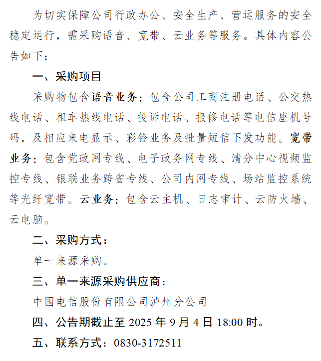 瀘州市公共交通集團有限公司語音、寬帶、云業務等服務單一來源采購公告
