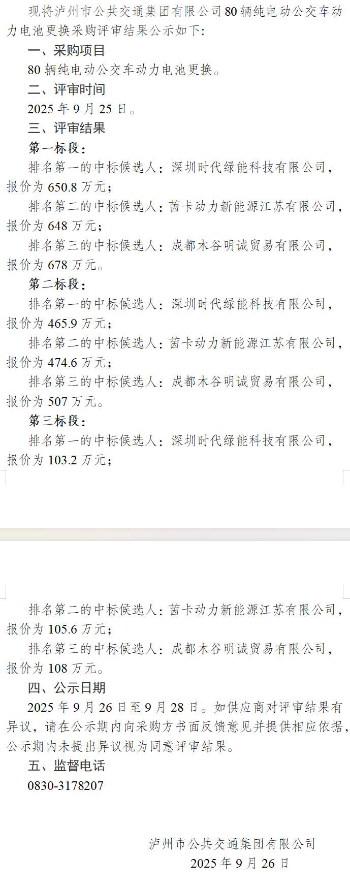 瀘州市公共交通集團有限公司80輛純電動公交車動力電池更換采購評審結果公示